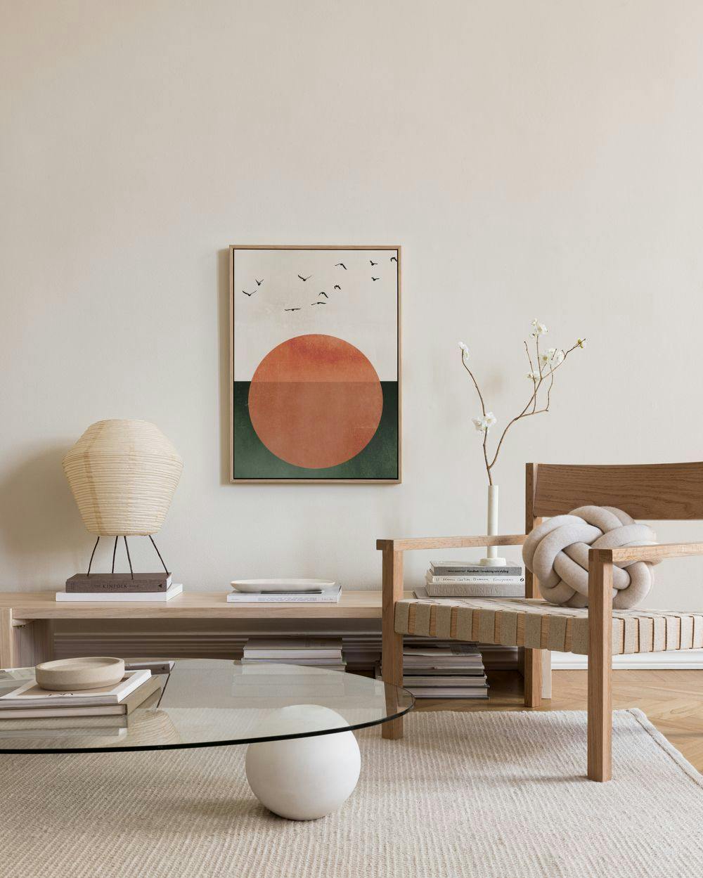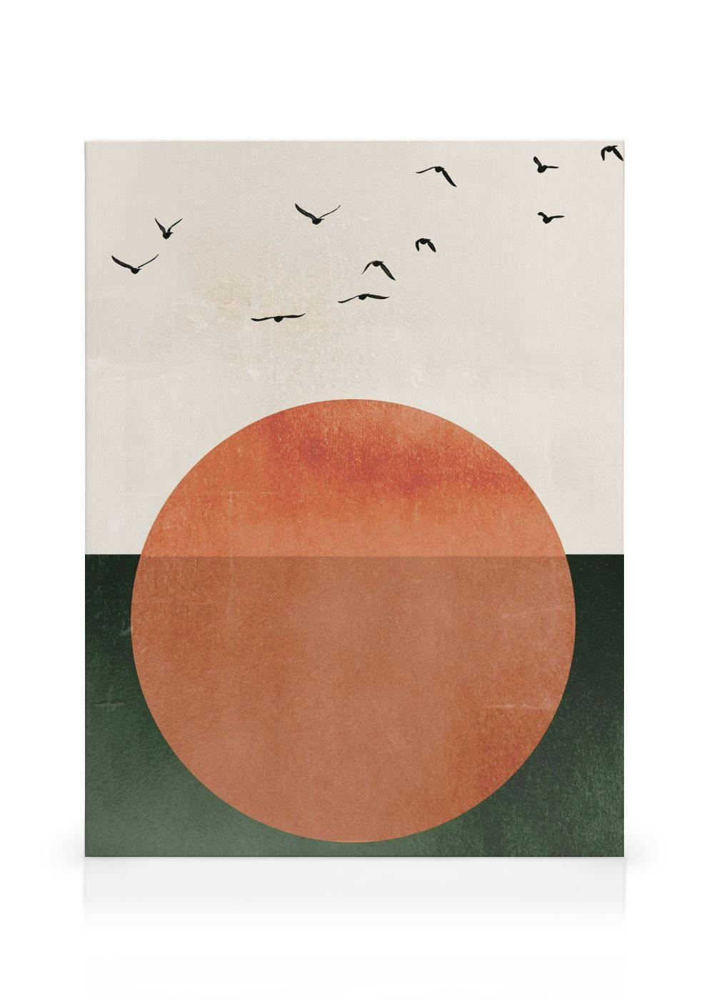 Eye-catching canvas print featuring a bold red-orange circle on a striped green, orange and cream background, accented by silhouettes of flying black birds.