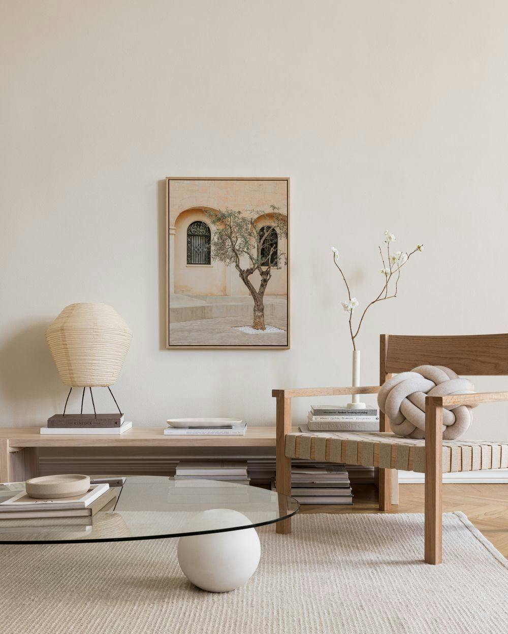 A canvas print showing a leafless tree in front of a cream stone wall with arched windows. Perfect for your gallery wall.