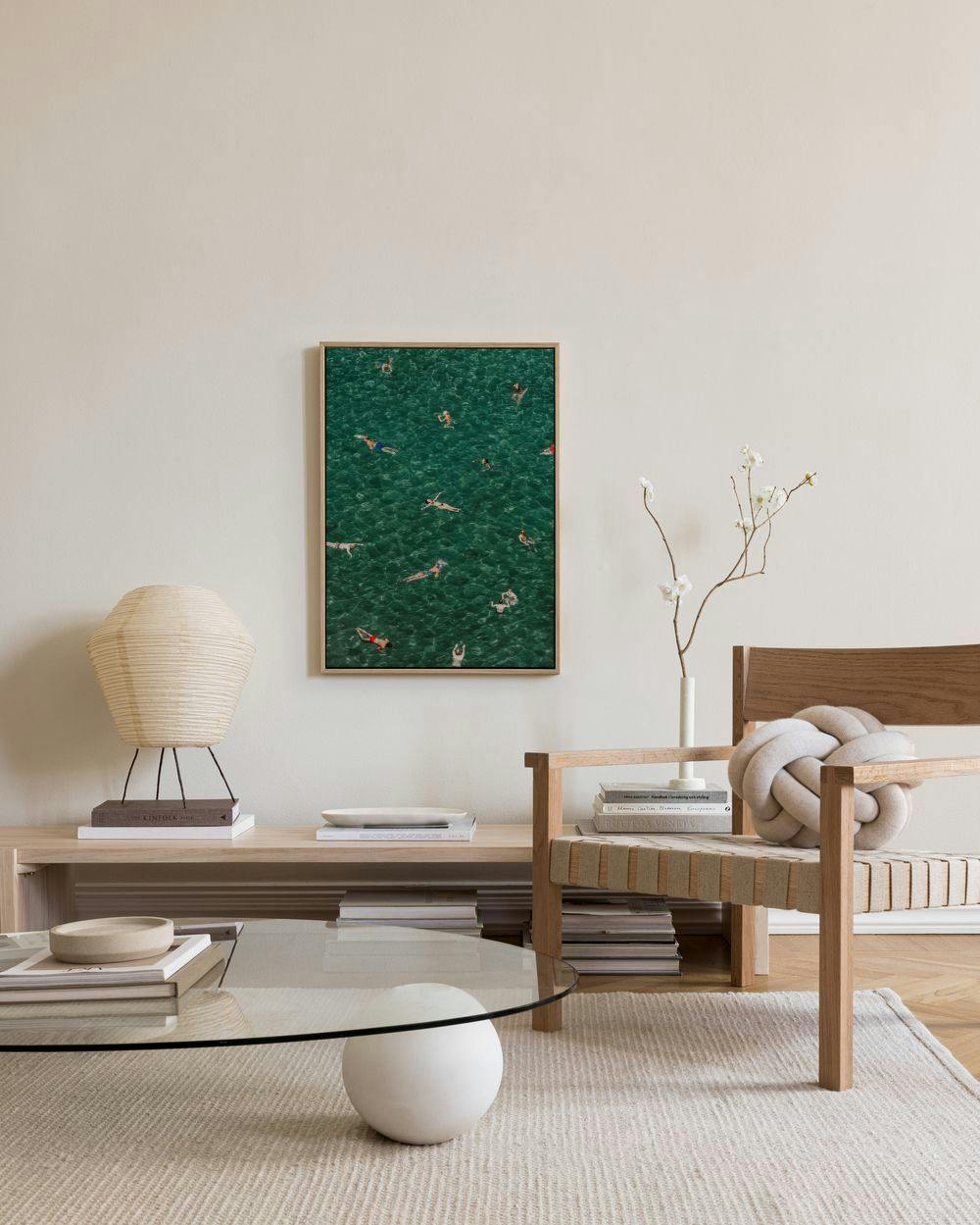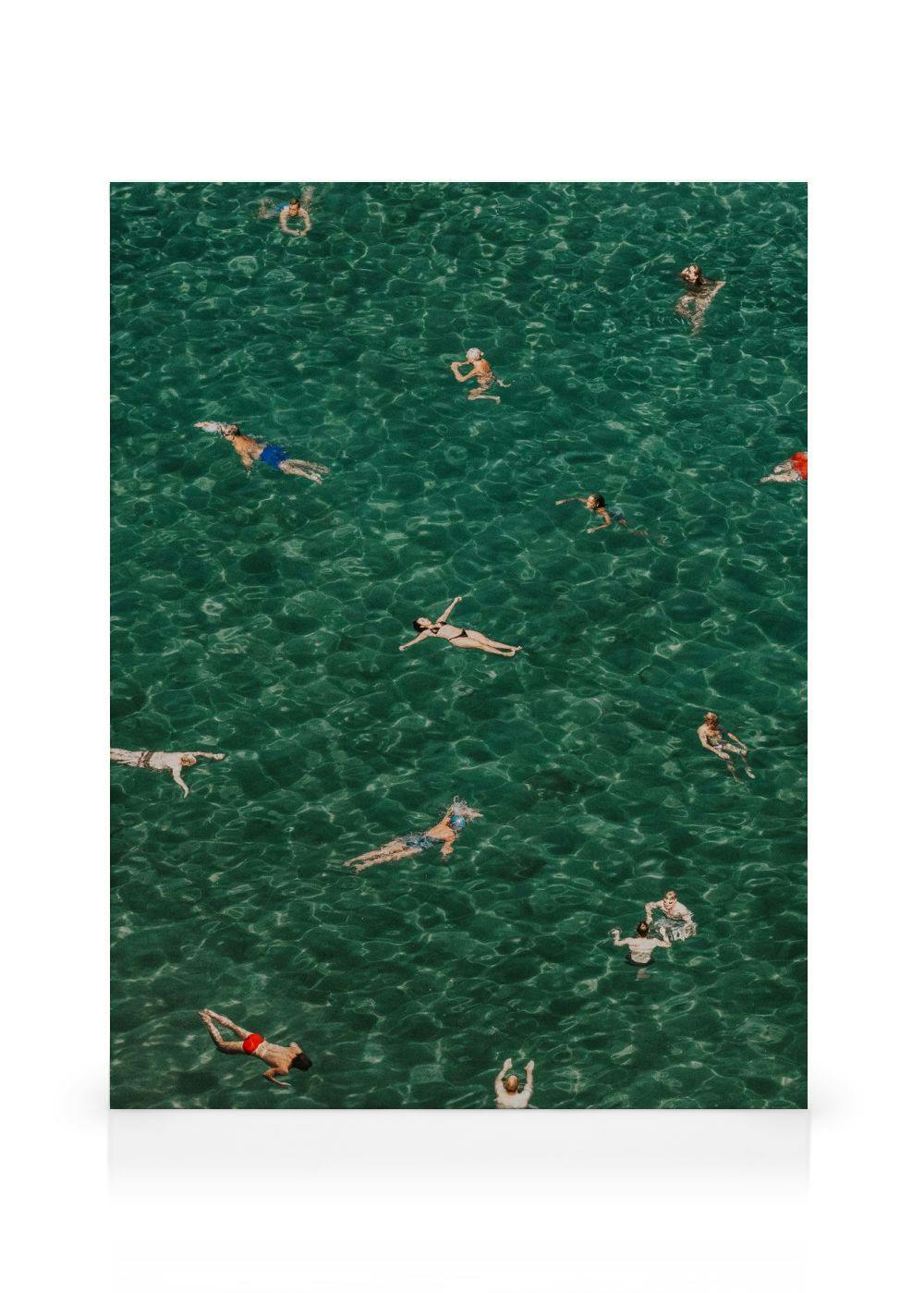 A canvas print with a grainy photo of people floating in bright blue water, captured from above. The perfect wall art to add a holiday vibe to your home.