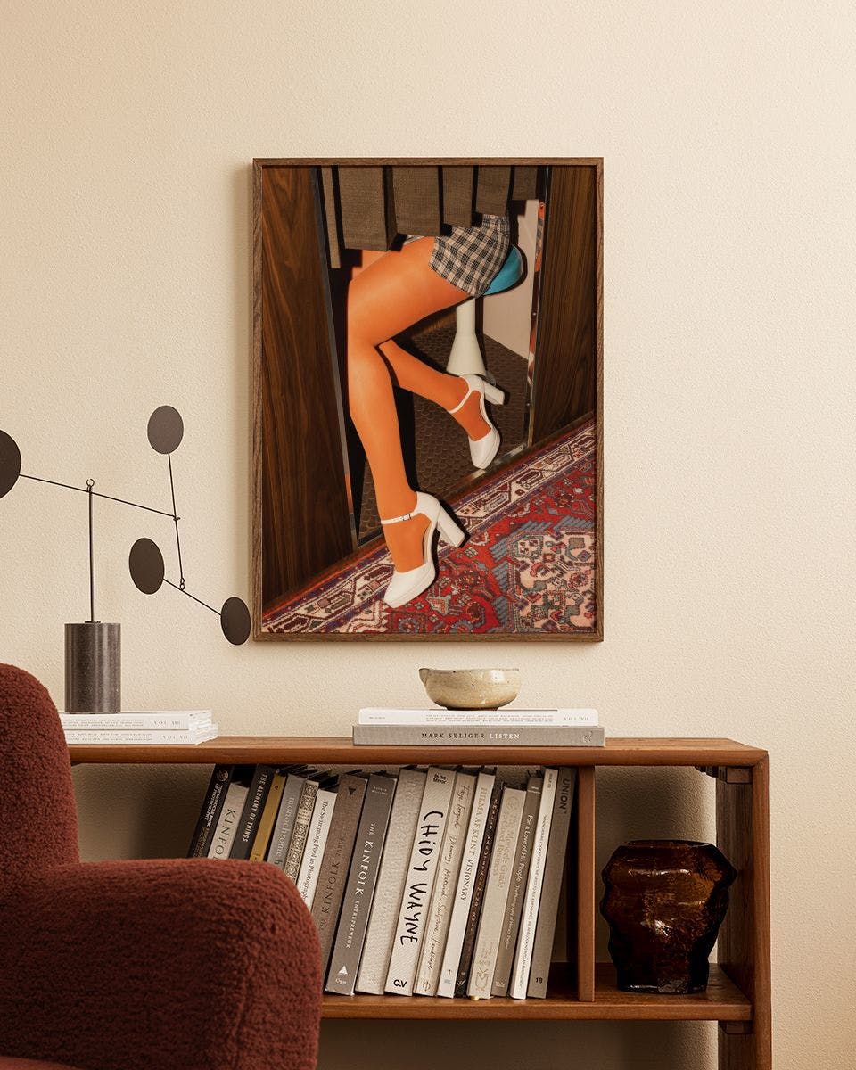A fun photo print showing orange tights and white heels and a checkered skirt sticking out of a photo botth. The retro photo creates a vintage feel.