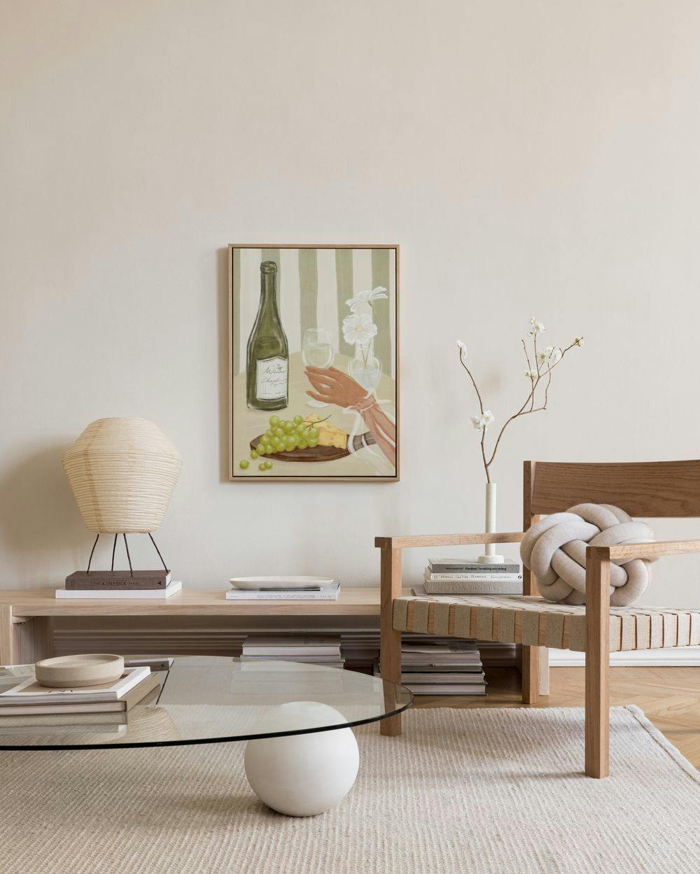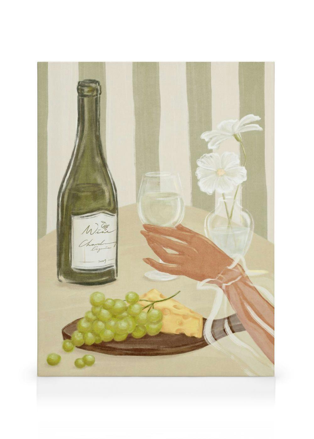 A charming canvas print featuring a still life with a bottle of wine, grapes, cheese, and flowers. Perfect for decorating your kitchen or dining area, or as part of a food and drink themed gallery wall.