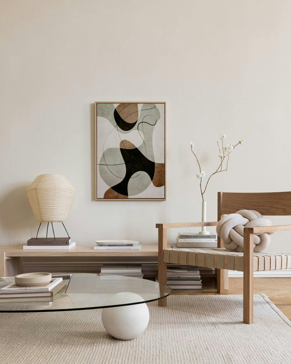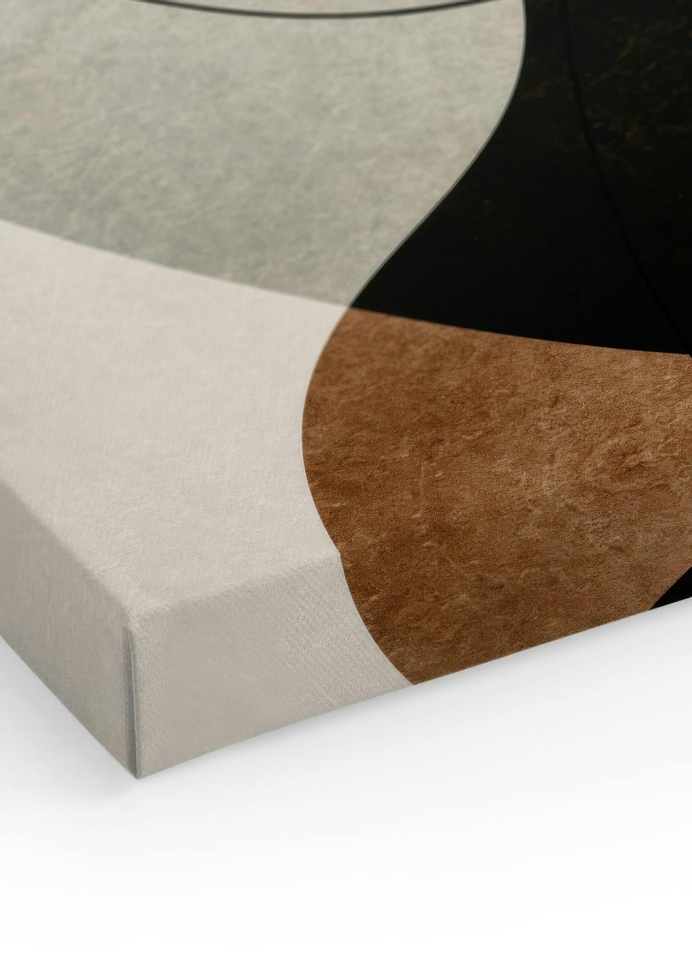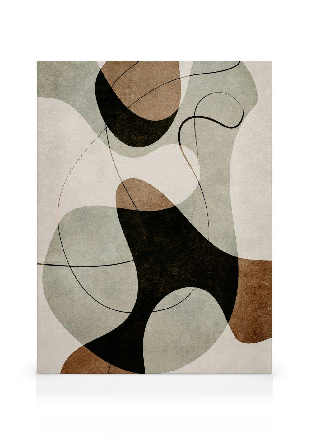 A modern abstract canvas print with overlapping brown, black and grey shapes on a white background. An elegant addition to any room.